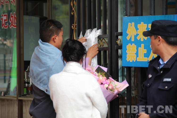 圖為考生考試結(jié)束后向母校的大門掛哈達(dá)表感激 攝影:德吉卓瑪
