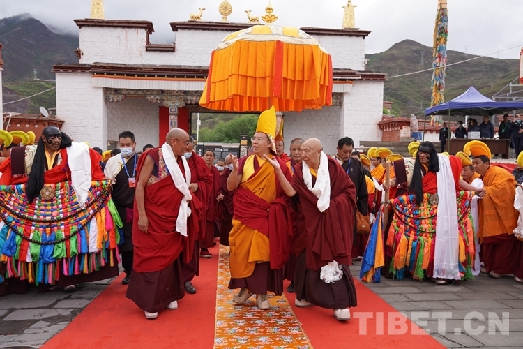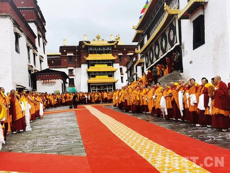 當天清晨,強巴林寺桑煙氤氳,僧人儀仗隊早早在寺廟正門通往措欽大殿的通道兩側手捧哈達列隊等候,以藏傳佛教最高宗教儀軌迎接班禪。