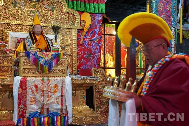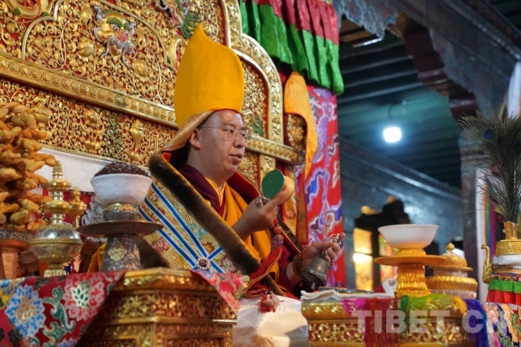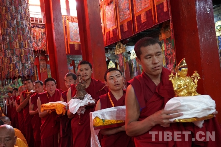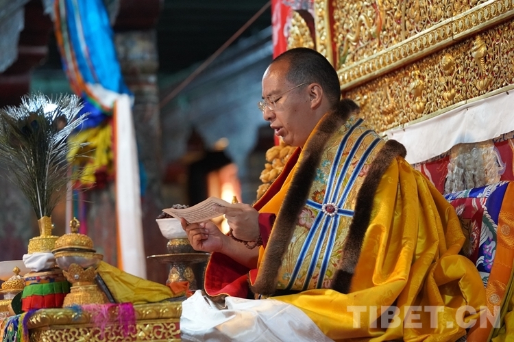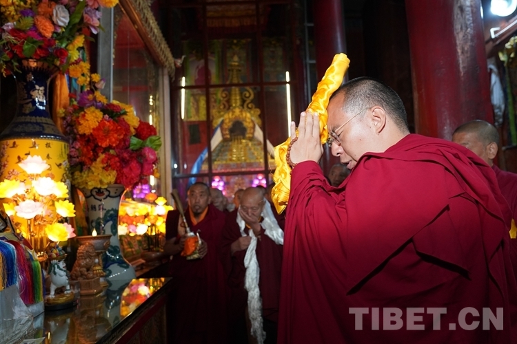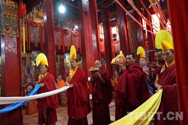 在措欽大殿內,班禪每到一座佛像前都雙手合十為眾生祈禱,并向佛像敬獻哈達,祈求國泰民安、利樂眾生。措欽大殿內的眾僧也并排而坐齊聲誦經(jīng)、虔誠祝禱。禮佛后,班禪登上措欽大殿寶座,寺廟高僧代表向班禪敬獻曼扎(佛像、經(jīng)書、佛塔)、誦祈愿永駐贊;班禪向寺廟僧眾傳授賜予《文殊真實名經(jīng)》,并為僧眾摸頂。