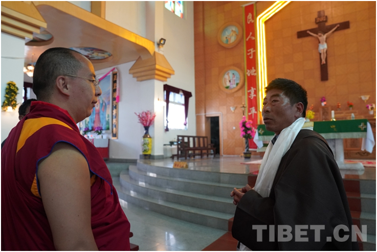 鹽井天主教堂是西藏目前唯一保存下來(lái)并持續(xù)在使用中的天主教建筑,它的存在證明了不同宗教在西藏的和諧相處。在鹽井天主教堂班禪詳細(xì)了解天主教堂歷史起源、文化傳承、服務(wù)信眾等情況,當(dāng)班禪看到藏語(yǔ)版的《圣經(jīng)》時(shí)饒有興致地進(jìn)行翻看。