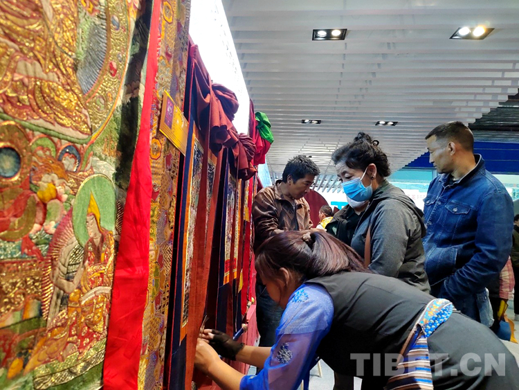 圖為市民在展銷活動(dòng)現(xiàn)場(chǎng)選購(gòu)唐卡