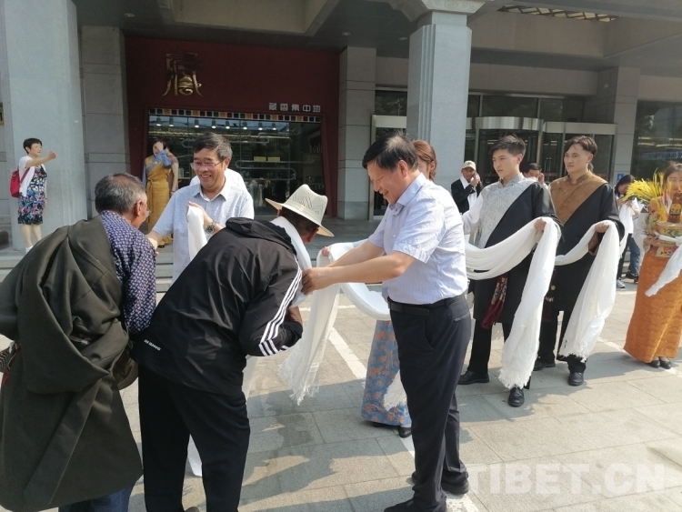 圖為北京建藏援藏工作者協(xié)會相關負責人為西藏村居兩委基層干部赴京考察學習團獻上哈達 攝影:王茜