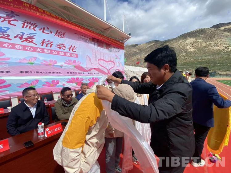 中國西藏網(wǎng)訊 6月19日,浙江金華市惠聚61愛心企業(yè)家團(tuán)隊(duì)萬里送愛心,在西藏森布日中學(xué)舉行“點(diǎn)亮微心愿·溫暖格桑花”公益活動(dòng)。