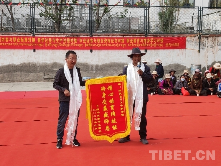 活動現(xiàn)場,學(xué)生家長代表向?qū)W校贈送錦旗并發(fā)表感言?!案兄x拉孜縣9+X中職學(xué)校培養(yǎng)了我的孩子,經(jīng)過學(xué)校的精心培養(yǎng),讓家人操碎心的孩子如今依靠從學(xué)校學(xué)到的技藝找到了一份滿意的工作,這讓我一家人感到很欣慰。”學(xué)生家長代表白瑪有感而發(fā),“希望在場的孩子們也通過發(fā)揮自己的優(yōu)勢,在社會上找到一份心儀的工作,同時(shí)真心祝福學(xué)校越辦越好?!?/p>