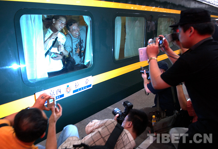 青藏鐵路開(kāi)通運(yùn)營(yíng),北京至拉薩的首趟列車在北京西站發(fā)車。這是發(fā)車前,車上旅客在車窗前向外展示手中車票,人們紛紛拍照留念(唐召明2006年7月1日攝)