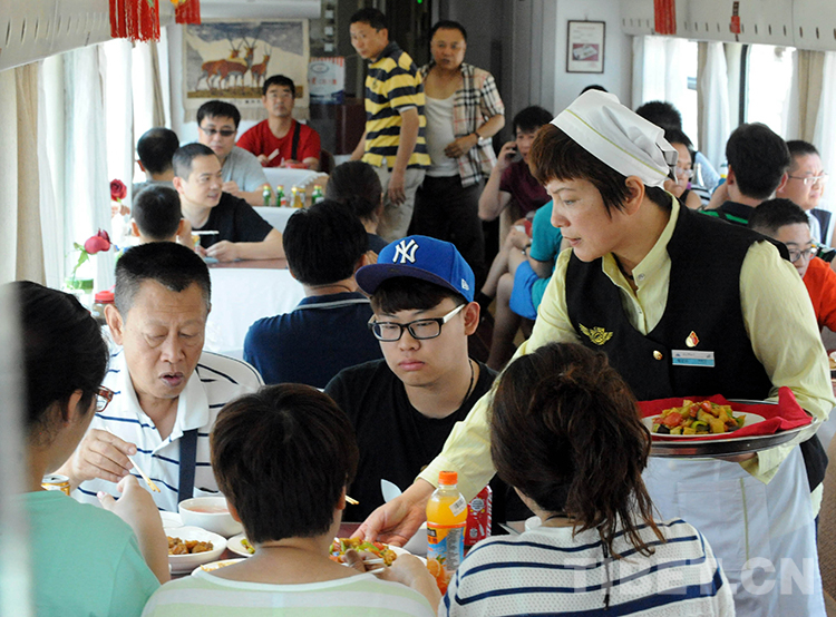 北京鐵路局北京客運(yùn)段京藏車隊(duì)副隊(duì)長(zhǎng)彭海燕在北京開(kāi)往拉薩的餐車上為就餐旅客服務(wù)(唐召明2014年7月5日攝)