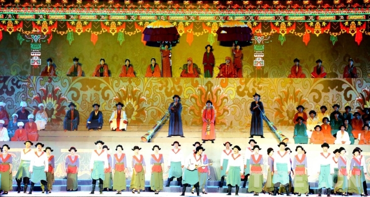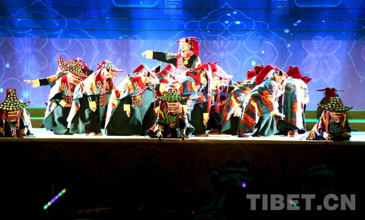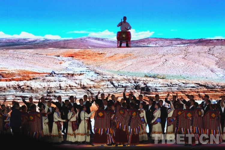 隨后盛大的開幕式文藝演出如期而至。演出共分為《悠遠(yuǎn)古韻》《詩意微芒》《如炬經(jīng)典》《輝煌盛世》四個(gè)篇章。《悠遠(yuǎn)古韻》篇章為大型情景表演,結(jié)合古格壁畫為開場表演,展現(xiàn)出阿里人民群眾的精神面貌和獨(dú)特的阿里神韻?!对娨馕⒚ⅰ穮R集阿里地區(qū)諸多極具代表性的國家級非物質(zhì)文化遺產(chǎn)節(jié)目,展現(xiàn)阿里地區(qū)悠久燦爛的古代文明遺存?!度缇娼?jīng)典》篇章通過不同舞蹈,展現(xiàn)阿里獨(dú)具特色的民間歌舞文化?!妒⑹老腋琛穭t展現(xiàn)了阿里地區(qū)以熱情昂揚(yáng)的姿態(tài)在全力以赴推動建設(shè)雪域高原“西部明珠”中取得的一系列可喜的成績。