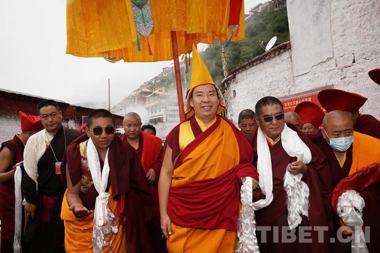 當(dāng)日11時許,在眾僧的期盼中,班禪一行抵達(dá)直孔替寺。頓時,現(xiàn)場法號齊鳴、法螺合奏,直孔瓊倉·洛桑強(qiáng)巴活佛和僧眾在寺廟前舉行了隆重的歡迎儀式。