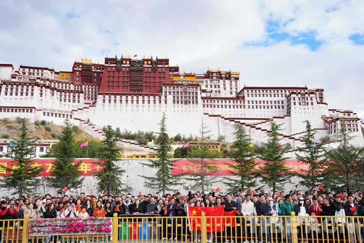 十月的拉薩秋高氣爽,云淡風(fēng)輕。升旗儀式正式開始前,布達拉宮腳下站滿了各地游客,他們有的揮舞著小旗,有的臉上貼著“我愛你中國”貼紙,期待著在海拔3650米的拉薩為祖國母親慶生。廣場內(nèi),西藏各族群眾身著節(jié)日盛裝,整齊肅立,共同期待五星紅旗冉冉升起的莊嚴時刻。