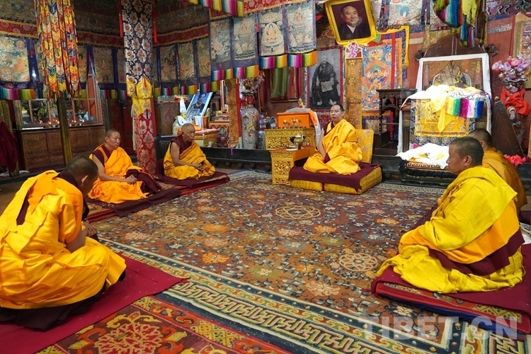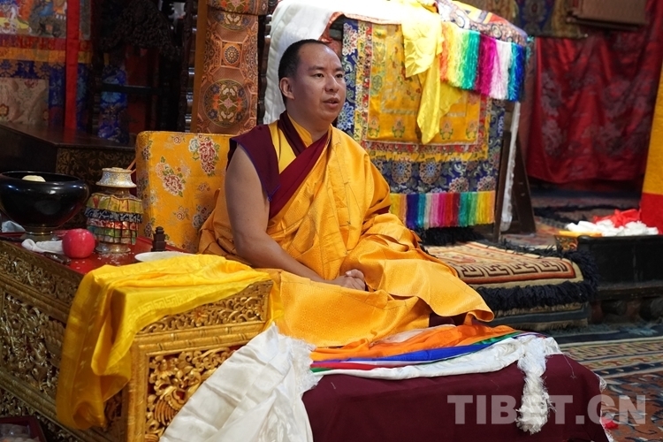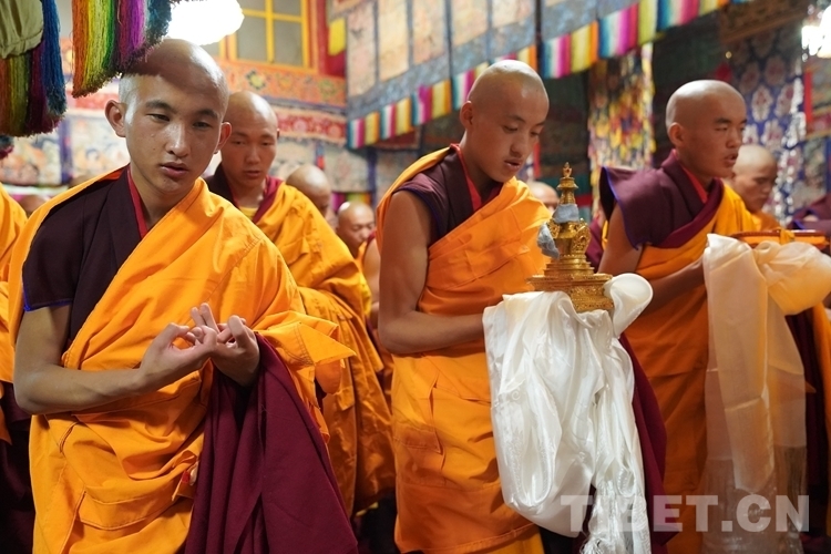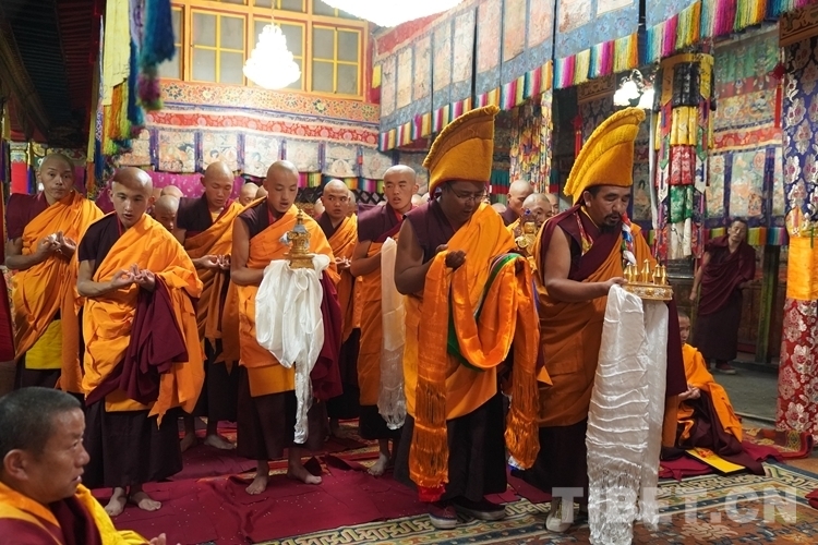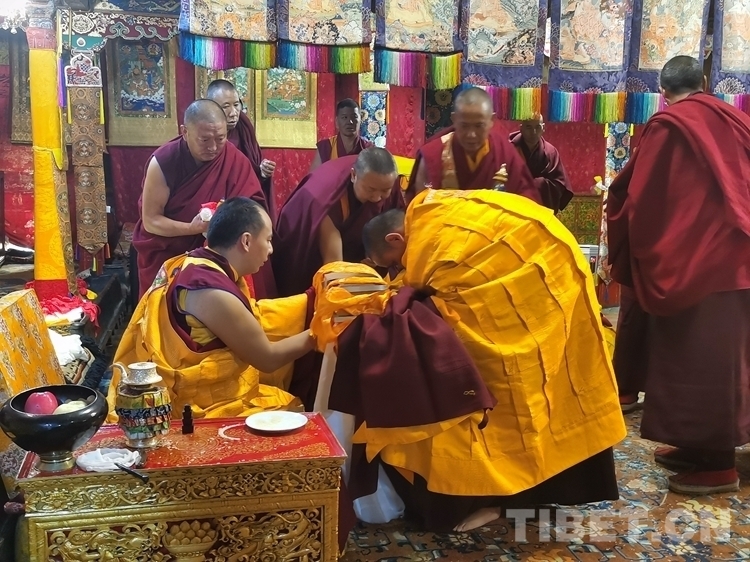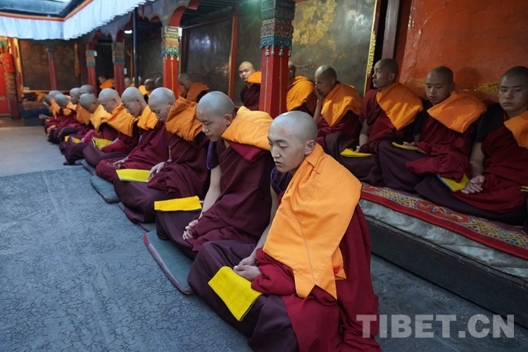 當(dāng)天清晨,扎什倫布寺桑煙繚繞、法號(hào)聲聲,28 位受戒的年輕僧人帶著新制袈裟,迎著朝霞依次走向拉讓殿等待班禪授戒這一神圣時(shí)刻的到來(lái)。8時(shí)許,在手持黃傘、香爐和吹嗩吶的高僧護(hù)送引領(lǐng)下班禪緩緩步入拉讓殿,并與在場(chǎng)僧眾集體誦經(jīng)。誦經(jīng)儀式結(jié)束后,班禪就坐于拉讓殿寶座,4名高僧大德作為授戒眾,開始為僧人閉門授戒、剃度、賜法名、摸頂。此時(shí),受戒僧人一一入座,兩手在胸前交叉,聽班禪引證經(jīng)典告誡,并宣誓嚴(yán)守戒律。