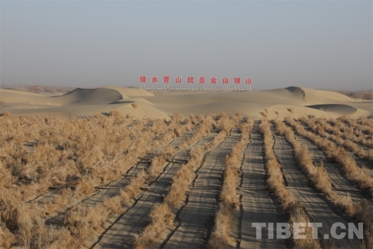 迎著日出的柔和光亮,步上沙漠綠洲觀景臺,就能與沙漠里的一抹紅色標語“迎面相視”。“綠水青山就是金山銀山”,這句鮮紅的標語在一片金黃沙丘和梭梭林里面顯得格外醒目。在起伏緩和的山丘上,眼前的一小片沙漠綠洲成為了蔚然生態(tài)林工程的一個典型注解。