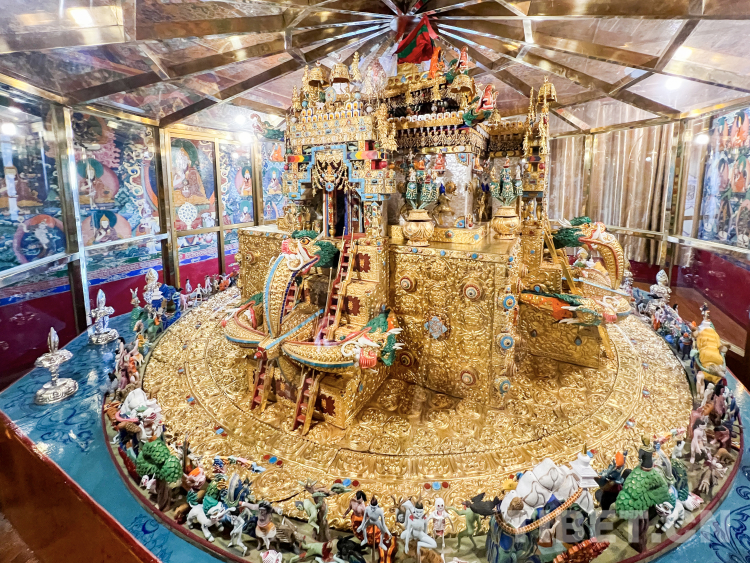 壇城,被稱(chēng)作“曼荼羅”,是藏傳佛教密宗的重要元素,承載了豐富的象征意義和深刻的修行內(nèi)涵,在藏傳佛教繪畫(huà)、寺院建筑、佛塔建筑、宗教法器、佛事活動(dòng)中被廣泛采用,并形成了固定的模式和種類(lèi)。 據(jù)扎什倫布寺僧人扎平介紹, “壇城從整體上來(lái)講有二維壇城、三維壇城之分,但按其造型形式,表現(xiàn)內(nèi)容和使用材料可分為平面繪畫(huà)壇城、立體建筑壇城、彩砂彩粉浮雕壇城等多種類(lèi)型。我們現(xiàn)在所看到的時(shí)輪壇城既是代表人體也是代表宇宙,它的每一個(gè)組成部分都與人體有著對(duì)應(yīng)關(guān)系。它是用金、銀、銅、木頭等制成的立體法器壇城模型,就像立體的宮殿,這類(lèi)壇城是作為密宗冥想法器,供陳列和膜拜使用。除此之外,還有金剛密法、喜經(jīng)剛兩座造型各異的壇城。殿堂頂部的壇城壁畫(huà)都是僧人以近乎于90度的立體筆觸繪制出來(lái)的,其難度可見(jiàn)一斑?!?nbsp;