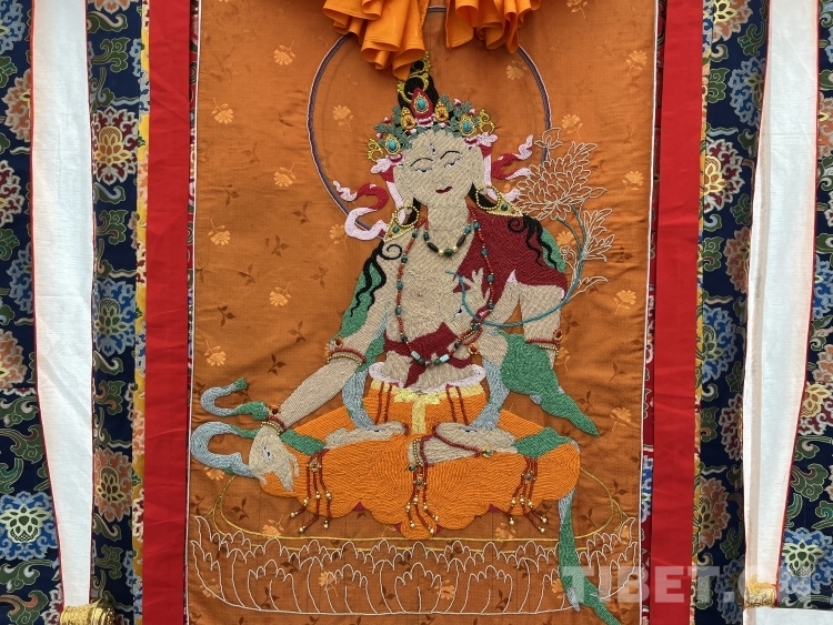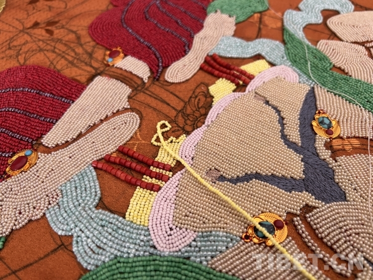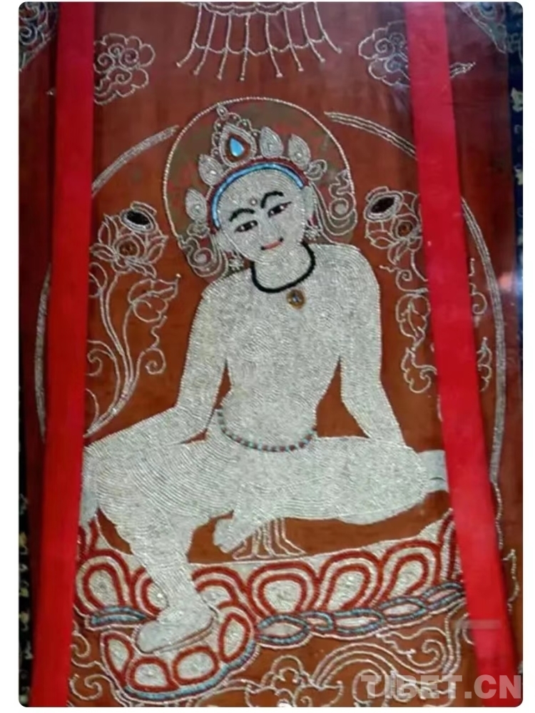 掌握了藏繡技藝,夫妻二人有了新的發(fā)展目標(biāo)。在傳承和發(fā)展傳統(tǒng)堆繡技藝的同時,土旦想要創(chuàng)新更有特色的藏繡作品,于是創(chuàng)作“珍珠唐卡”的想法在他腦海中萌生?!爸韵胍獎?chuàng)作珍珠唐卡,是因為有次我在山南的昌珠寺看到了‘觀世音菩薩憩息圖’這幅珍珠唐卡,我被它精美絕倫的制作工藝深深吸引,心想自己從事堆繡創(chuàng)作多年,也應(yīng)該去嘗試制作‘珠繡’作品了。”土旦向記者講述了他與珍珠唐卡的“結(jié)緣”經(jīng)歷。