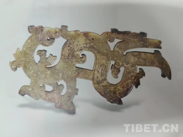 最精妙的是,玉佩整體呈片狀,兩面鏤雕相同紋飾。龍張口回首,龍身滿(mǎn)飾谷紋,尾上雕一大鳥(niǎo),龍頭內(nèi)外側(cè)及尾部又各凸雕一小鳥(niǎo),于龍身中部有一圓形鉆孔。此種龍鳳佩是戰(zhàn)國(guó)時(shí)期特有的造型,手法夸張,圖紋精美,線條卷曲相連,體現(xiàn)了制作者豐富的想象力。(中國(guó)西藏網(wǎng) 綜合/周晶 攝影/楊月云)
