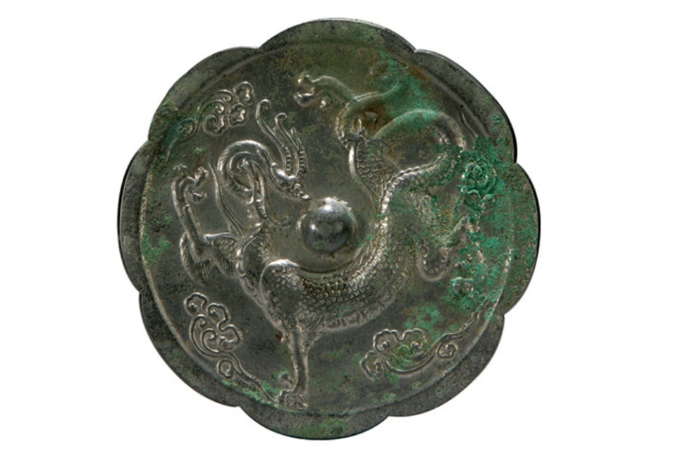 此件青銅龍紋鏡為葵花形,鏡背以紐為中心,龍紋為單體,呈蟠曲狀,四周分布云紋。龍的長角翹起,巨口張開,身體遒勁,脖頸細長,似在回首戲珠。唐代有帝王在千秋節(jié)向群臣頒賜銅鏡之俗,這種賜予臣下的銅鏡多以龍紋裝飾,稱千秋鏡或天子鏡。也許是天子所賜,所以此龍的姿態(tài)看上去遒勁有力,同時又顯得生動活潑,仿佛在每日的使用中能給人以活力。(中國西藏網(wǎng)綜合/周晶)