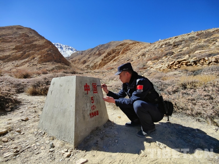 巡邏結(jié)束回到執(zhí)勤點(diǎn)后,邊巴次仁并沒有卸下執(zhí)勤裝備,而是拿著毛筆和紅油漆朝著執(zhí)勤點(diǎn)的河對(duì)岸走去,過(guò)河幾百米便是中尼5號(hào)界樁?!爸挥袌?jiān)守在邊境的我們才能體驗(yàn)到,除夕這天,為界碑描紅的自豪感。”他拿出毛筆跟紅漆一筆一劃地描著界碑上的每一個(gè)字?!懊杓t界碑那一刻,眼前是界碑,身后是祖國(guó),我們守的是萬(wàn)家燈火?!边叞痛稳恃凵駡?jiān)定地看著身前的界碑說(shuō)。