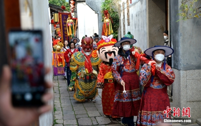 圖為福州三坊七巷天后宮舉行“迎財(cái)神”民俗巡游活動(dòng),吸引許多人駐足觀看。攝影:呂明