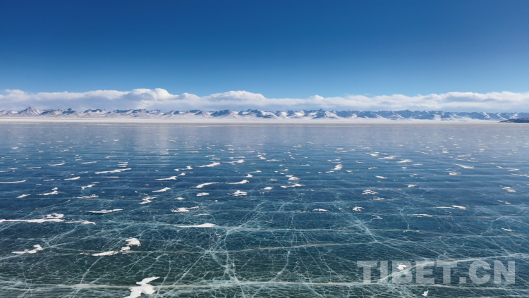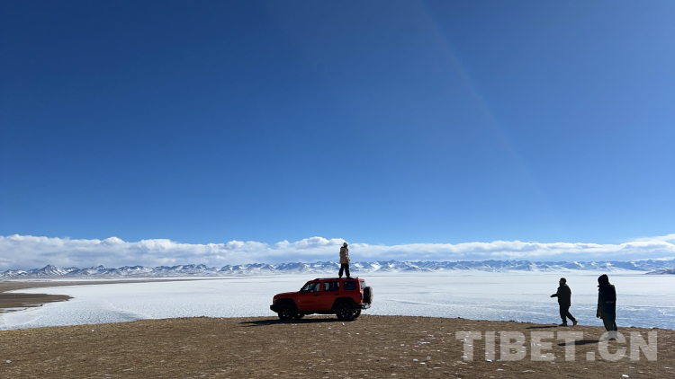 爬上一座山丘,視野陡然明亮開闊起來。原本土黃色的藏北天然牧場高低起伏,黑牦牛零星地散落在山坡,登上高處后,天際圣境納木錯(cuò)便映入眼簾。初春時(shí)節(jié)的拉薩依然春寒料峭,納木錯(cuò)的落雪還未完全消融,站在高處俯視,這片安靜的大湖被陽光反射得白茫茫一片。更幸運(yùn)的是碰到了晴好的天氣,白云與湖冰相襯,亦與遠(yuǎn)山相接,視線盡頭的念青唐古拉山脈直視無礙,畫面猶如“半池白云半池玉”般頗具美感。