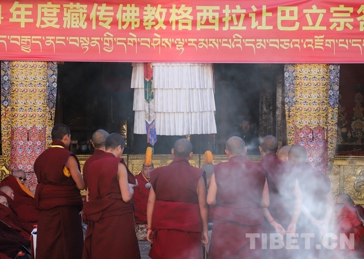 當(dāng)日上午9時,立宗答辯儀式正式開始,儀式由藏傳佛教學(xué)經(jīng)僧人考取格西拉讓巴學(xué)位考評委員會主持。按照傳統(tǒng)慣例,先舉行無齋佛事活動,在考評委員會的監(jiān)考下,應(yīng)考格西拉讓巴學(xué)位的12名考僧輪流答辯陪考僧眾所提有關(guān)《釋量論》《般若學(xué)》《中觀學(xué)》《俱舍論》《戒學(xué)》五部經(jīng)典方面的內(nèi)容。立宗答辯儀式結(jié)束后,所有參加答辯儀式的僧人集體誦經(jīng)祈禱,同時供齋茶齋飯。齋后,由西藏自治區(qū)宗教局負(fù)責(zé)人代表西藏自治區(qū)政府向參加答辯活動的僧人發(fā)放布施。