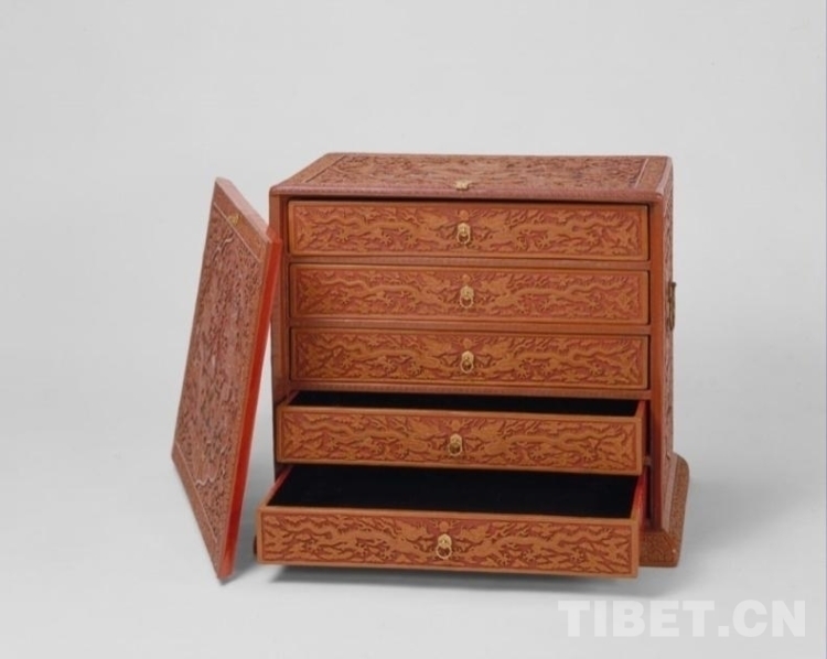 箱子兩側及蓋面紋飾與插門相同,僅龍紋為單龍戲珠。箱背面為綠色海水,上雕松鶴圖,鶴有六只,寓意“六合同春”“松鶴延年”。箱內裝抽屜五具,無遮擋,寬寬敞敞,屜面雕云龍戲珠紋。底座雕纏枝小朵花卉紋。(中國西藏網 綜合/周晶)
