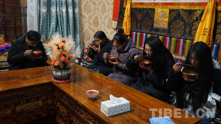 下午時(shí)分,“古突”夜的準(zhǔn)備就開(kāi)始了,先是將羊肉放入鍋中燉煮,再是將白蘿卜切片備好,隨后與奶奶、兩個(gè)女兒及丈夫,一家人圍坐在溫暖的廚房說(shuō)說(shuō)笑笑地捏“古突”里的面疙瘩,做面疙瘩時(shí),要準(zhǔn)備一些稍大的特殊面疙瘩,分別包進(jìn)寫(xiě)有石子、辣椒、羊毛、木炭等字樣的紙條,代表“心腸硬”“刀子嘴”“心腸軟”“黑心腸”等含義,待到吃“古突”環(huán)節(jié),來(lái)一場(chǎng)藏式風(fēng)格的“開(kāi)盲盒”,據(jù)說(shuō)每個(gè)人吃到的字樣能在某種程度上代表新一年的運(yùn)勢(shì)或性格。