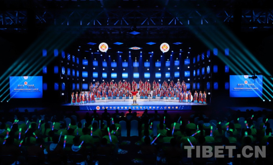 圖為西藏自治區(qū)拉薩市紀(jì)念西藏民主改革65周年千人合唱大賽在拉薩師范高等??茖W(xué)校體育館舉行