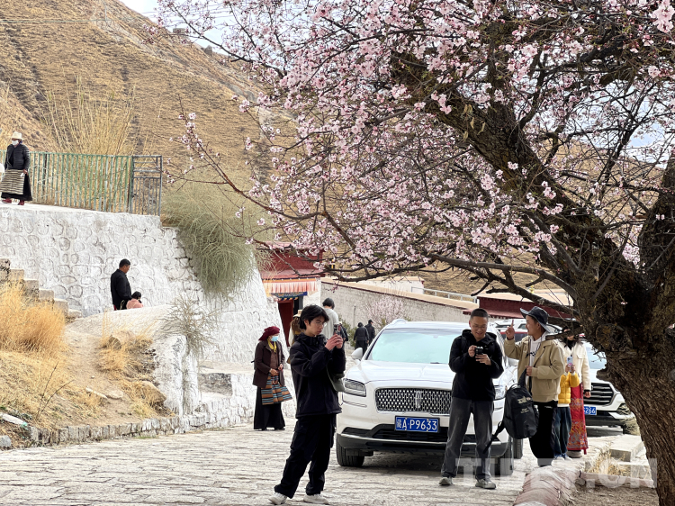 圖為帕邦喀古建筑與桃樹同框的畫面