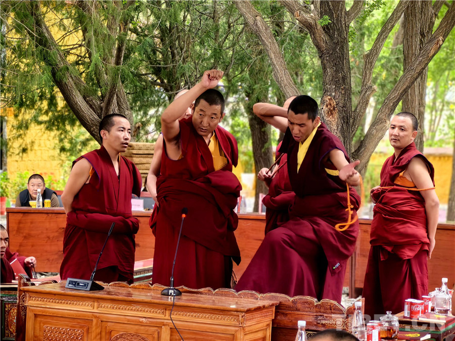 午后的陽光慵懶地灑在辯經(jīng)場,卻擋不住辯經(jīng)的智者們爭先恐后、高舉手臂提問,手臂向下?lián)]落,象征著智慧之劍砍向無知。熱烈的氣氛中,智者們拍手擊掌、獨(dú)立頓足、舞動佛珠、慷慨陳詞、大聲質(zhì)問,仿佛如此便得到了無窮的智慧。活動現(xiàn)場氣氛十分熱烈、精彩紛呈,交流內(nèi)容充實(shí)飽滿、將所學(xué)與實(shí)際相結(jié)合,充分展現(xiàn)了日常所學(xué)所思所得,閃光思維的碰撞迸發(fā)了智慧的火花,贏得了現(xiàn)場觀眾拍手叫絕,陣陣掌聲。