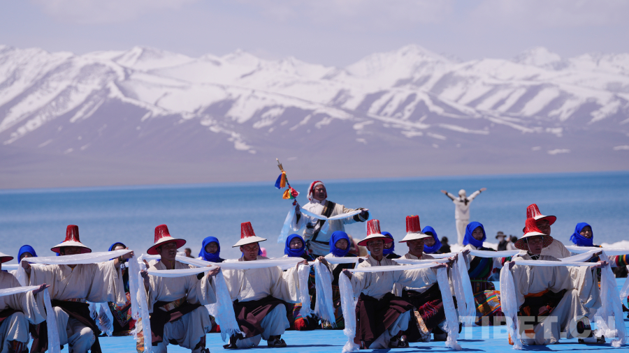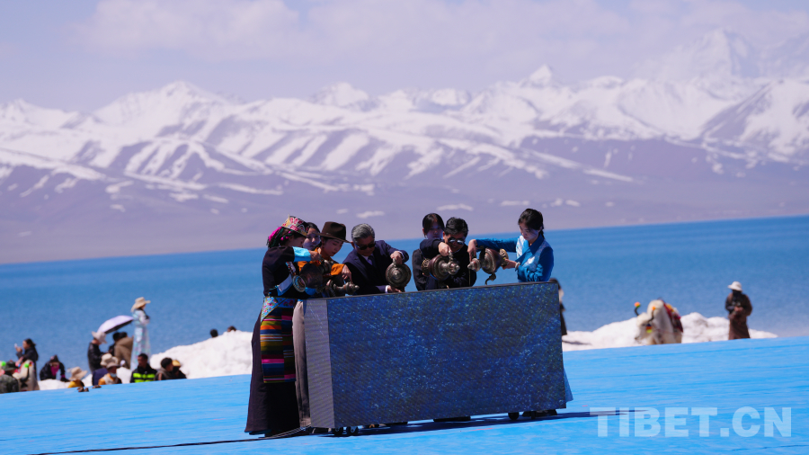 念青唐古拉山脈皚皚雪山高聳入云,清澈碧藍的納木錯湖水一望無際,牧民牽著白牦牛在湖邊悠閑地散步,成群的棕頭鷗發(fā)出歡快的叫聲在空中自由飛翔……在令人如癡如醉的絕美景色為背景的祈福儀式上,身著盛裝的300名演員結(jié)合當?shù)孛袼孜幕?,手捧哈達、牛角、烏爾朵(拋石器)等呈現(xiàn)盛大的祈福儀式,給現(xiàn)場觀眾帶來一場羌塘高原別具一格的視覺盛宴。