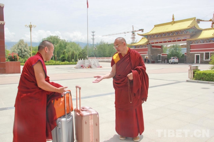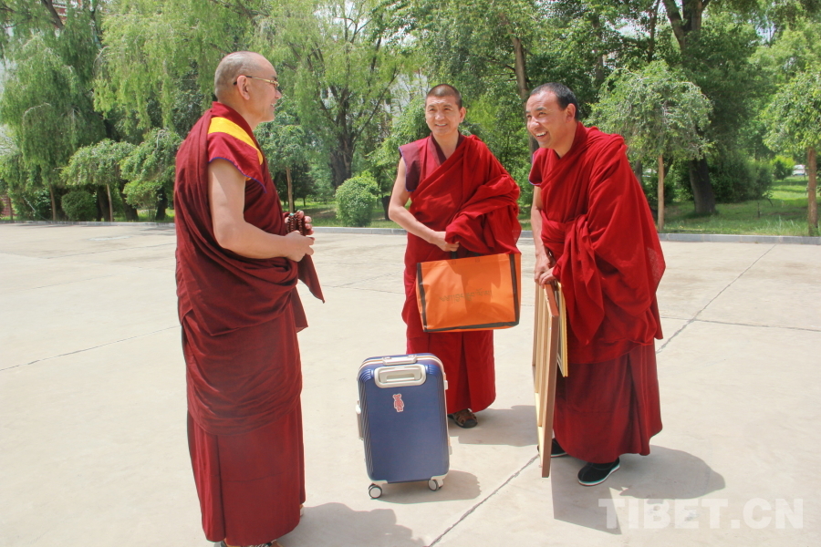 圖為青海省藏語系佛學(xué)院教務(wù)處副處長、特級(jí)經(jīng)師悟嘉倉(右一)與準(zhǔn)備離校的畢業(yè)學(xué)僧交談 攝影:劉莉