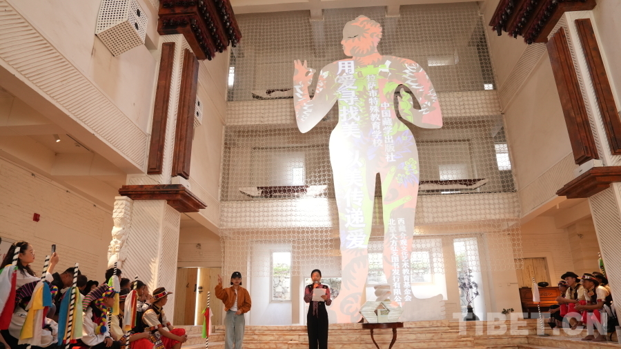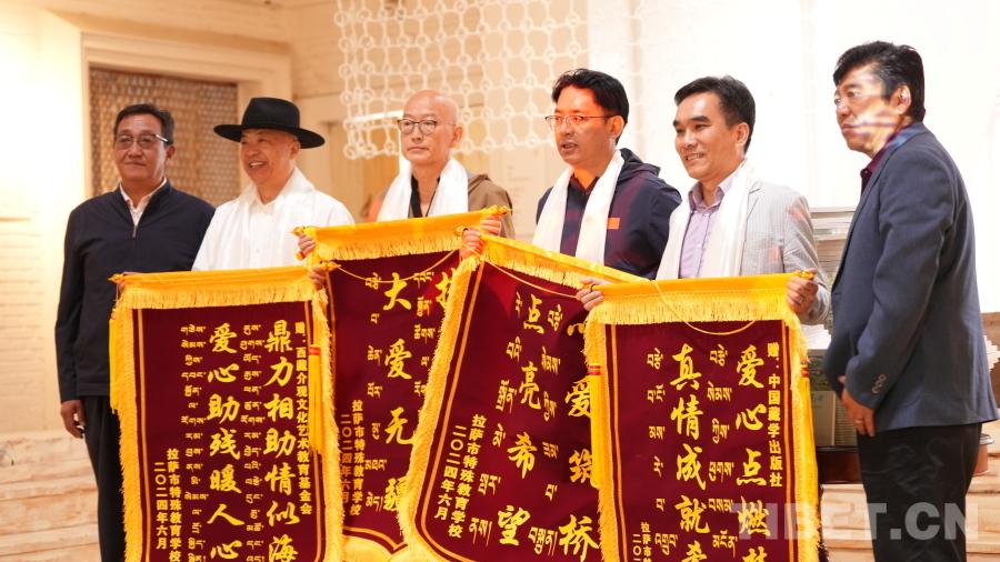 活動(dòng)現(xiàn)場(chǎng),拉薩市特殊教育學(xué)校師生向西藏社會(huì)主義學(xué)院羅旦博士、中國(guó)藏學(xué)出版社代表、北京大方弘文圖書發(fā)行有限公司代表、西藏介觀文化藝術(shù)教育基金會(huì)代表敬獻(xiàn)了哈達(dá),贈(zèng)送了錦旗、畫作,對(duì)他們?cè)谛聲霭嬷薪o予的支持和幫助表達(dá)了誠(chéng)摯的謝意。隨后,拉薩市特殊教育學(xué)校學(xué)生為現(xiàn)場(chǎng)來(lái)賓表演了二重唱《愛(ài)在陽(yáng)光下》、詩(shī)歌朗誦《光明》、舞蹈《舞動(dòng)大地》等精彩的節(jié)目,將活動(dòng)推向高潮,現(xiàn)場(chǎng)觀眾紛紛鼓掌叫好,氣氛十分感人。