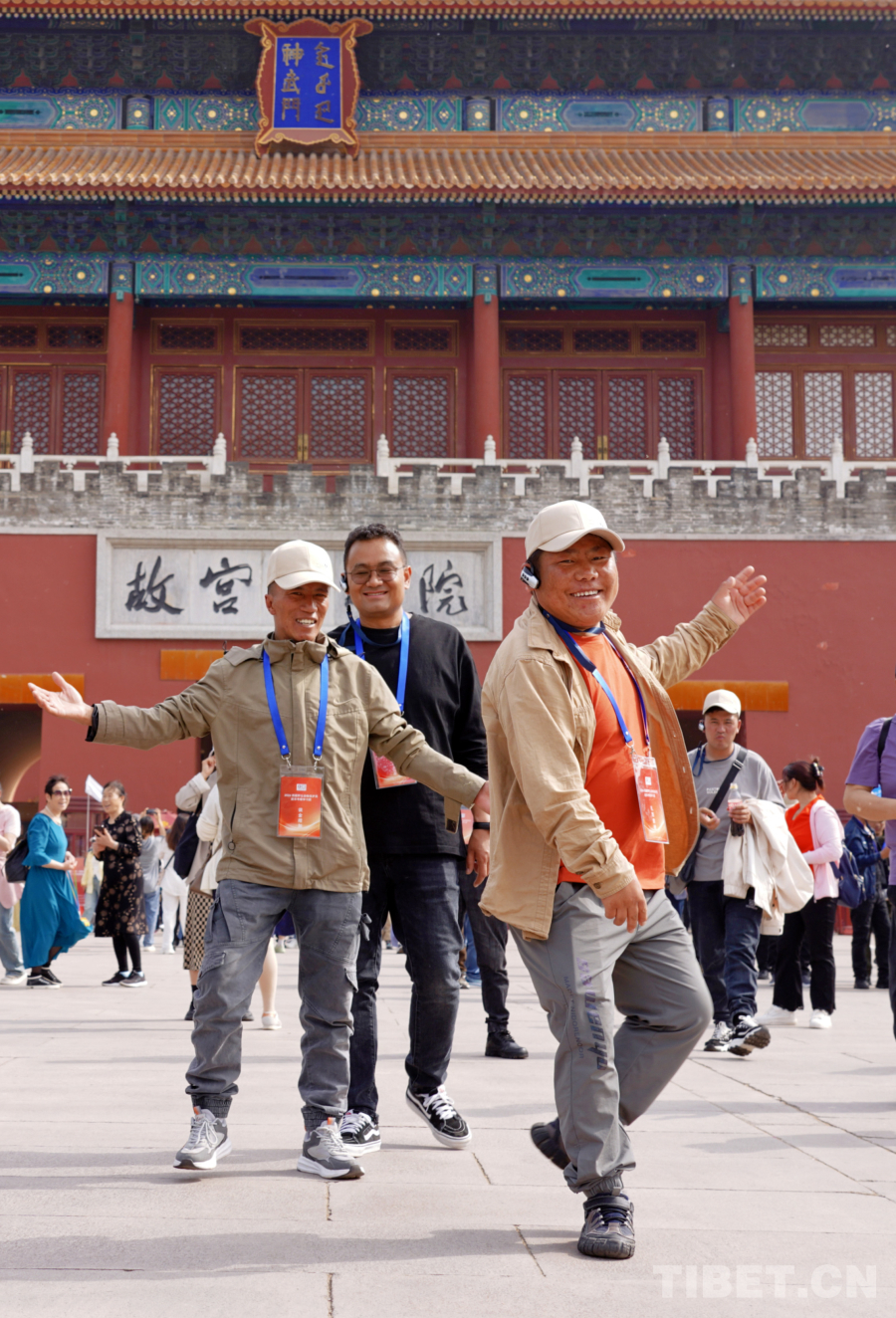 圖為羌塘國家級(jí)自然保護(hù)區(qū)尼瑪縣羅布玉杰管理站野保員扎西索朗(右一)在北京故宮博物院參觀時(shí),情不自禁地跳起鍋莊舞(王麒龍2024年4月25日攝)