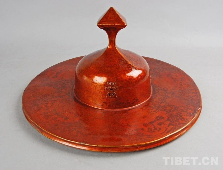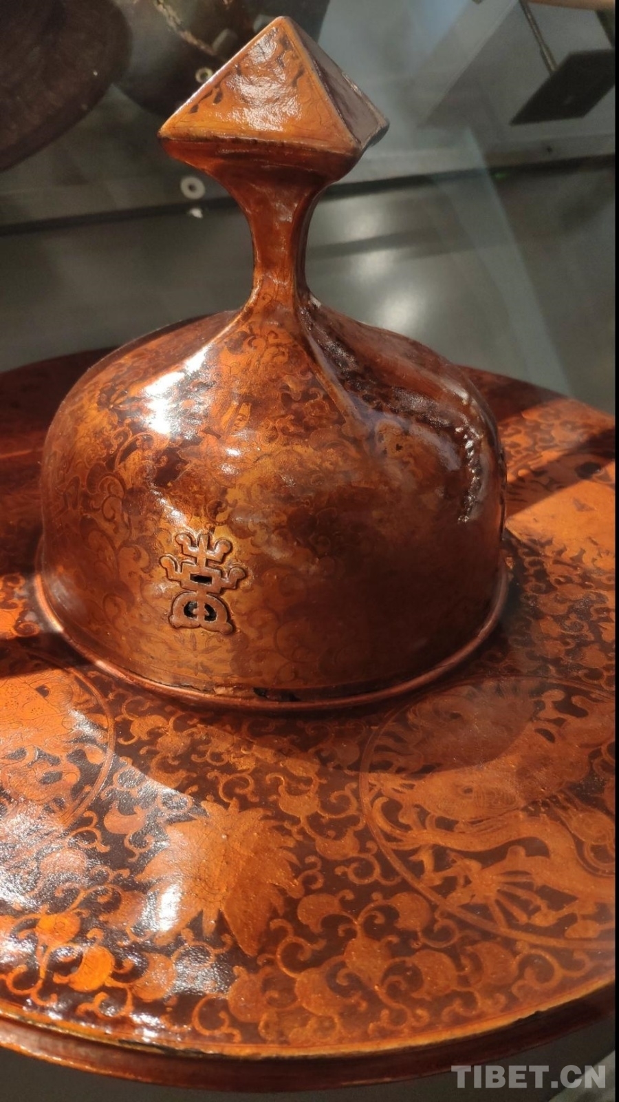14號藏品為僧官帽,出自西藏,進(jìn)入館藏時間為1905年。據(jù)博物館介紹,這頂漆帽原屬于寺院一位僧官所穿服飾的一部分。過去,西藏地方政府實(shí)行“政教合一制度”,寺院作為一個地方的宗教事務(wù)和寺院自身的管理者和統(tǒng)治者,同時又是這個地方社會的主要管理者和統(tǒng)治者。因此,遍布西藏各地的寺院往往都是當(dāng)?shù)氐恼巍⒔?jīng)濟(jì)、文化中心,具備政治、經(jīng)濟(jì)、教育、司法等職能。寺院內(nèi)部設(shè)立不同級別或不同分管領(lǐng)域的僧官來共同管理整個寺院的內(nèi)外政教事務(wù)。