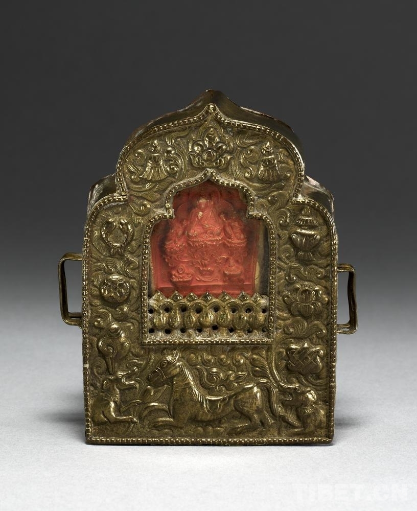 19號藏品為銅制“嘎烏”,內(nèi)裝有“擦擦”和香料包,出自西藏,進(jìn)入館藏時間為1905年?!案聻酢?,是藏語的音譯,指護(hù)身佛的盒子,即小型佛龕。盒子里一般裝有“擦擦”佛像、印著經(jīng)文的綢片、舍利子或者甘露丸、由高僧念過經(jīng)的藥丸,以及活佛的頭發(fā)、衣服的碎片等。“嘎烏”還是精美的裝飾品。其形狀不一,一般為銀質(zhì)或銅質(zhì),盒面上鑲嵌有瑪瑙、綠松石,雕刻有多種花紋圖案。
