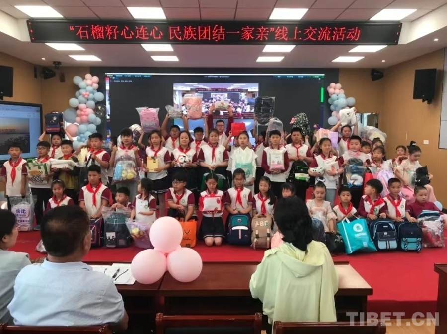 圖為安徽明光市逸夫小學與西藏浪卡子縣浪卡子鎮(zhèn)小學開展“石榴籽心連心民族團結(jié)一家親”線上交流活動