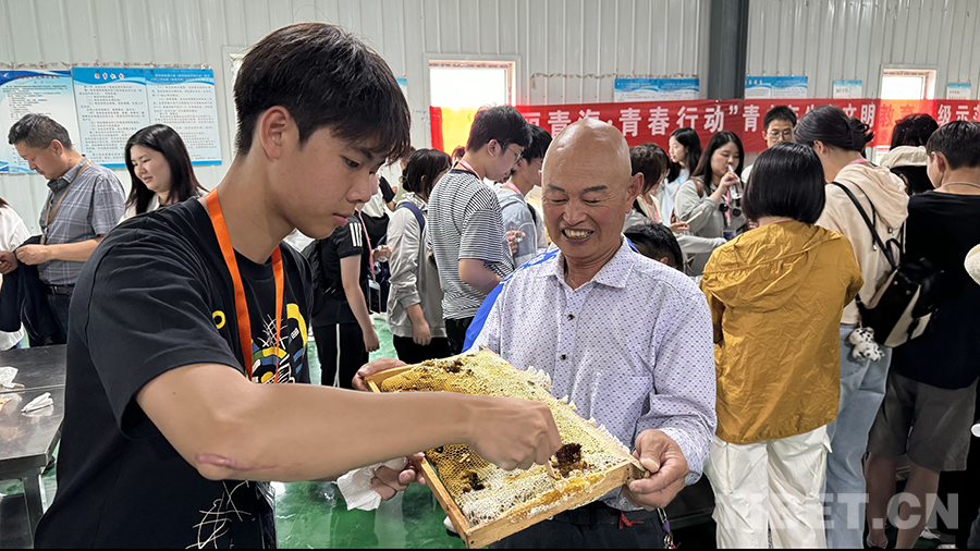 7月11日,140余名香港青少年帶著對(duì)知識(shí)的渴望來(lái)到海南州貴德縣,踏上了生態(tài)研學(xué)之旅。在青藏華峰中蜂蜂業(yè)有限公司保種場(chǎng)(以下簡(jiǎn)稱保種場(chǎng)),群山環(huán)抱,樹(shù)木蔥蘢的山坡里分布著許多蜂箱,同學(xué)們?cè)邳S河岸邊與中華蜜蜂來(lái)了場(chǎng)親密邂逅。