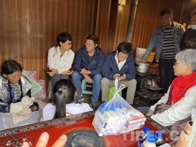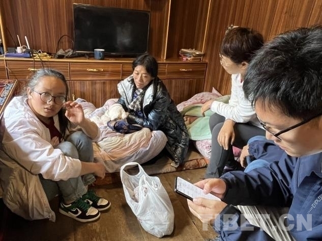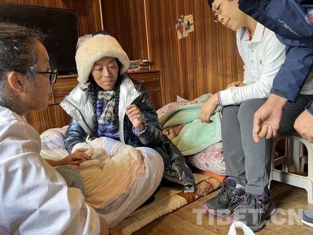 在義診活動(dòng)進(jìn)行的同時(shí),幾位專家還分撥前往貧困家庭慰問。其中,北京地壇醫(yī)院的中醫(yī)科副主任楊玉英,北京地壇醫(yī)院婦科副主任劉軍,北京老年醫(yī)院呼吸科副主任劉前桂,北京大學(xué)第一醫(yī)院骨科副主任徐貝宇一行來到了離措拉鎮(zhèn)不遠(yuǎn)的德西村山坡上,去阿珍家慰問看診。據(jù)了解,阿珍的母親沖曲措于 2019 年進(jìn)行了胃癌手術(shù),術(shù)后做了五次化療,于 2020 年末完成化療。然而,2024 年 6 月份,沖曲措又被查出患有肺炎。由于吃不下飯,沖曲措體重嚴(yán)重下降,營養(yǎng)嚴(yán)重不良。。