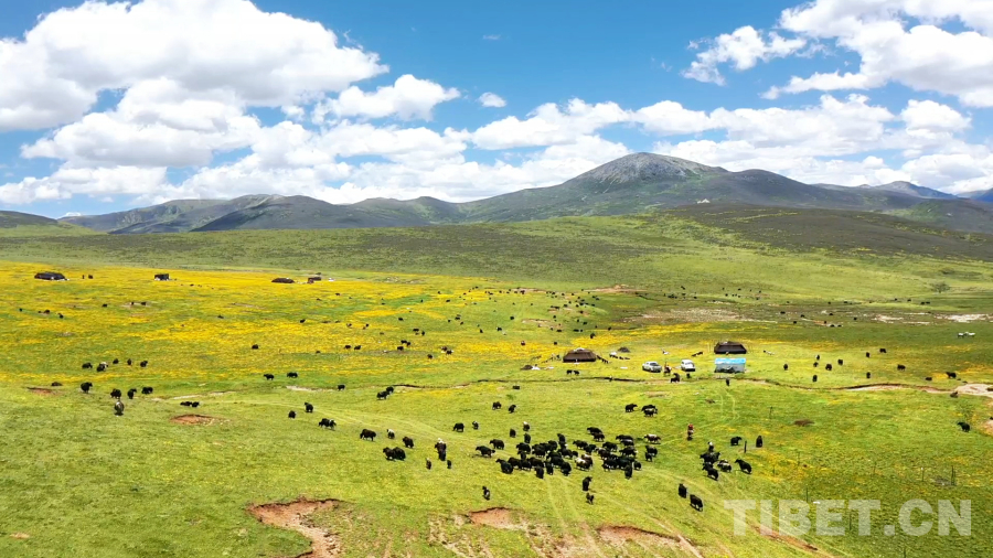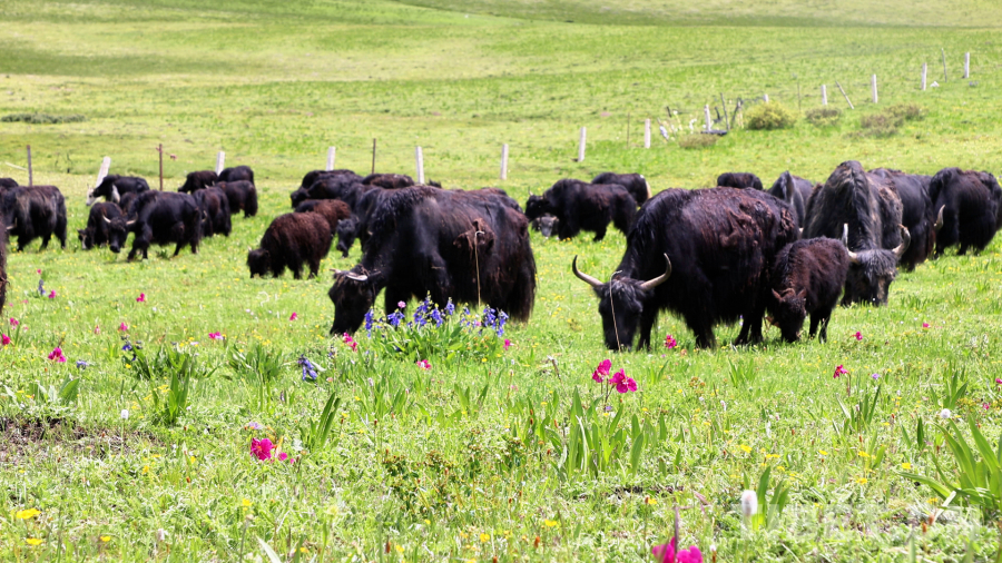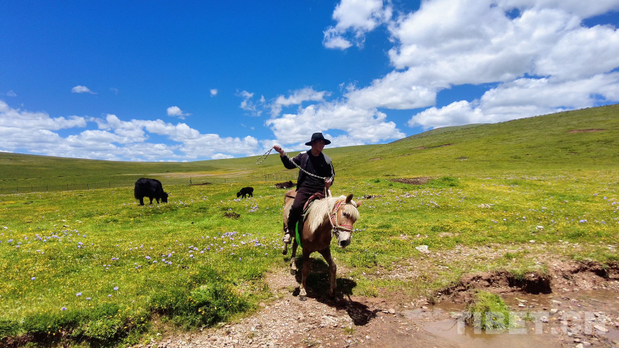 早晨天剛蒙蒙亮,他們就準(zhǔn)備出發(fā)了,一家人把生活必需品黑帳篷,火爐,鍋碗瓢盆,被褥及酥油糌粑等物資打包裝車,由家人先駕駛拖拉機(jī)把所有物資運(yùn)送到夏季遠(yuǎn)牧點(diǎn),四郎彭措則和他的侄兒騎馬趕牛出發(fā)。冬季牧場到夏季牧場距離60公里,他們經(jīng)過9個(gè)小時(shí)的遷徙,終于在下午3點(diǎn)到達(dá)夏季牧場。此時(shí)他的家人也在鄰居的幫助下搭好了帳篷,煮好了酥油茶等待著他們。到了夏季牧場,牦牛們也迫不及待奔向了肥美的水草,四郎彭措和他的侄兒也終于可以卸下滿身的疲憊,品嘗家人們準(zhǔn)備好的美食。夏季牧場正是一年當(dāng)中最美的季節(jié),草原上開滿了五顏六色的花朵,多日不見的好友也帶著自己的家人早一步駐扎在此地,四郎彭措說道:“夏季放牧,轉(zhuǎn)場雖然辛苦,但也是一年中難得的閑暇時(shí)光。夏季水草肥美,牦牛們有充足的食物,來到夏季牧場放牧的牧民也有更多的活動時(shí)間,賽馬、唱歌、跳鍋莊舞是我最喜歡的活動?!?/p>