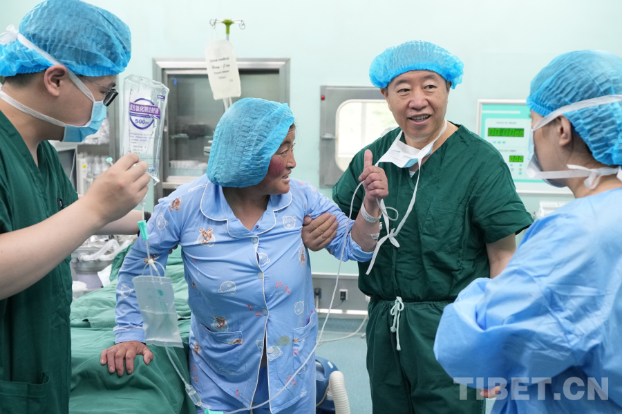 圖為手術(shù)室內(nèi),剛剛完成局部麻醉微創(chuàng)椎管擴(kuò)大減壓手術(shù)的藏族患者穆女士在張西峰(左三)的指導(dǎo)下成功站立,并為張教授的精湛醫(yī)術(shù)點贊。