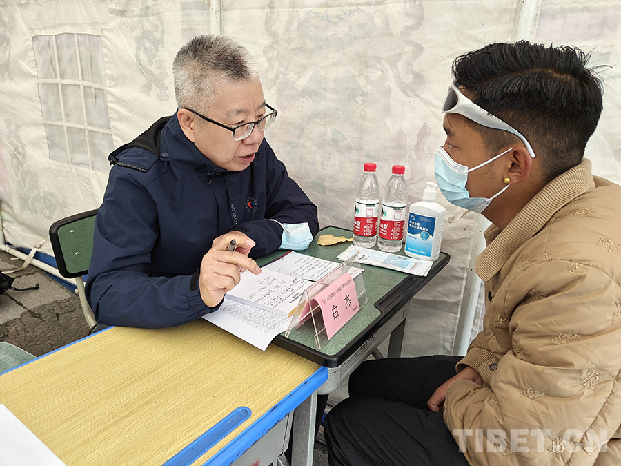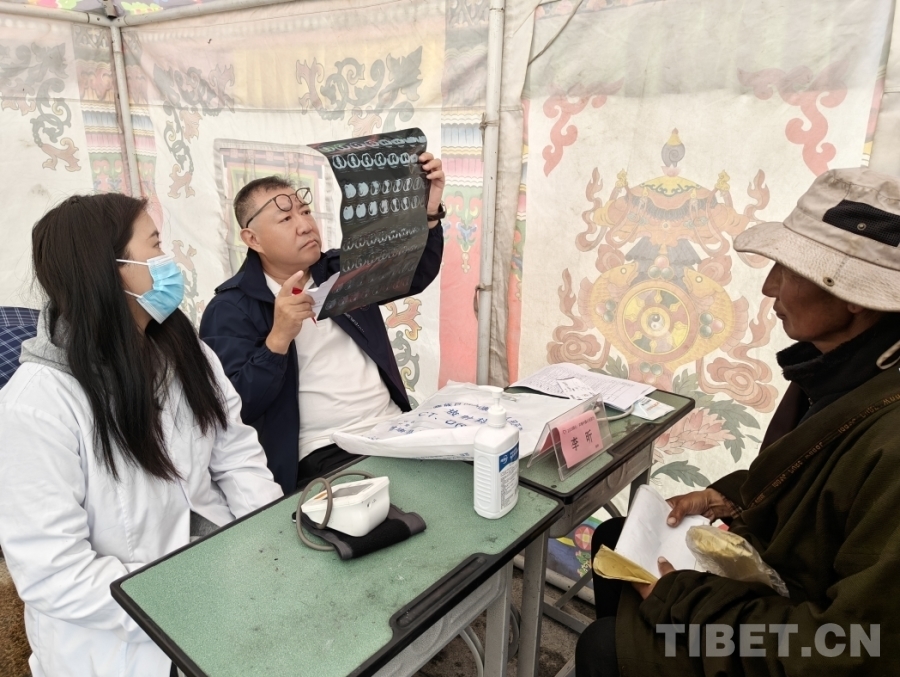 圖為中醫(yī)科副主任醫(yī)師白杰在塔公鎮(zhèn)為當?shù)鼐用窳x診 供圖:北京同心共鑄公益基金會
