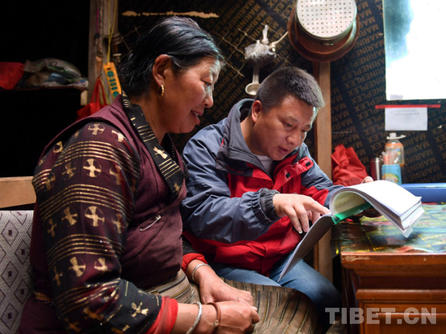 圖為山南市社保工作人員在玉麥鄉(xiāng)玉麥村村民央宗家中進(jìn)行社保信息補(bǔ)充登記,普及社保政策