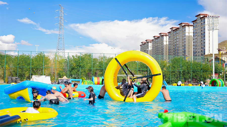 圖為參賽選手們體驗(yàn)水上趣味活動(dòng)
