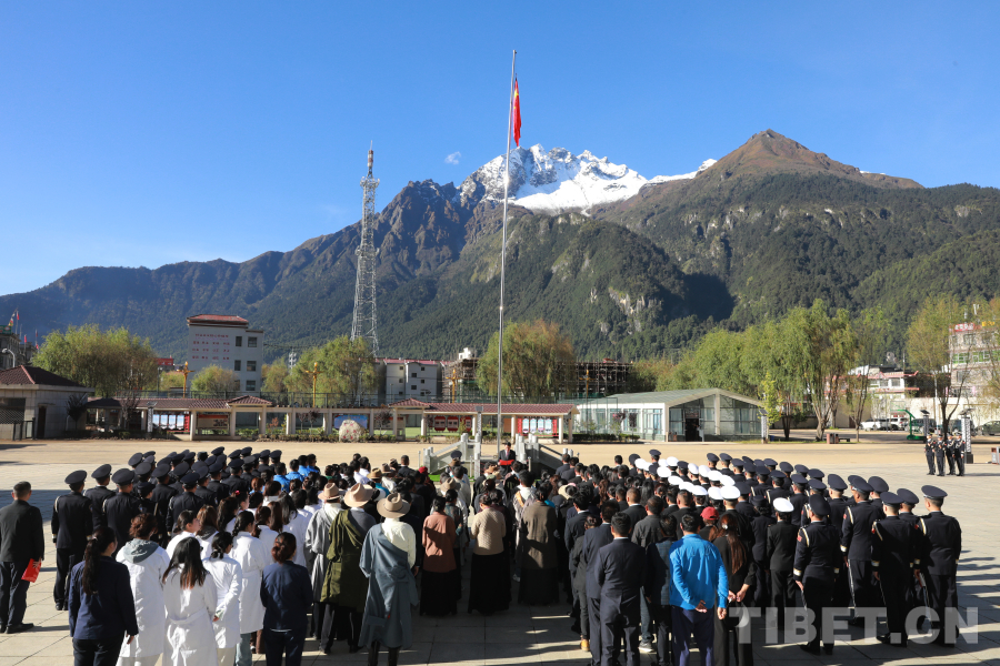 圖為10月1日上午,吉隆縣國門黨建一體化“大黨委”舉辦“七十五載迎盛世 砥礪前行續(xù)華章”主題活動(dòng),組織成員單位在吉隆出入境邊防檢查站營區(qū)舉行升國旗儀式 攝影:肖富貴