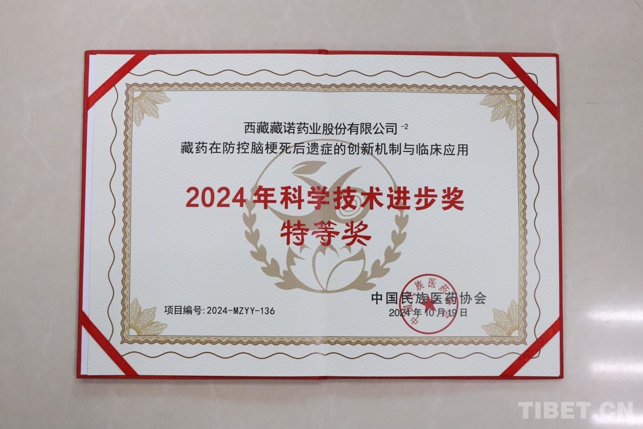 經(jīng)過申報、內(nèi)審和組織有院士、國醫(yī)大師等各民族專家組成的專家委員會初評、終評、公示、報備等環(huán)節(jié)和程序,由河北醫(yī)科大學(xué)第二醫(yī)院、西藏藏諾藥業(yè)股份有限公司、石家莊藏諾藥業(yè)股份有限公司聯(lián)合申報的《藏藥在防控腦梗死后遺癥的創(chuàng)新機制與臨床應(yīng)用》被授予“2024年中國民族醫(yī)藥協(xié)會科學(xué)技術(shù)進步獎”特等獎。