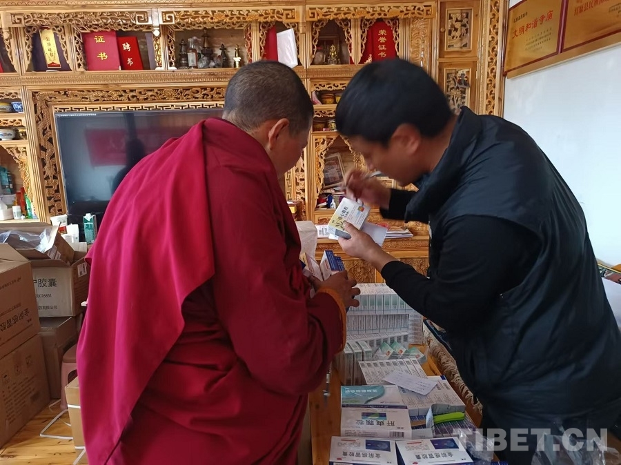 圖為工作人員照方為覺姆發(fā)放藥品并講解服用注意事項(xiàng) 攝影:賈春玲