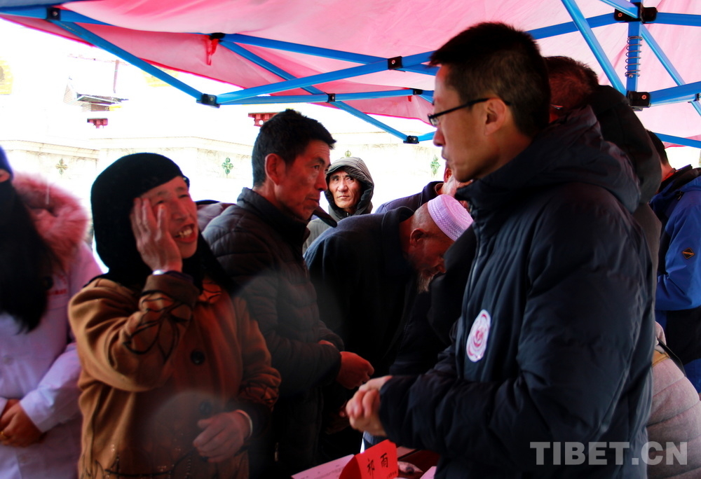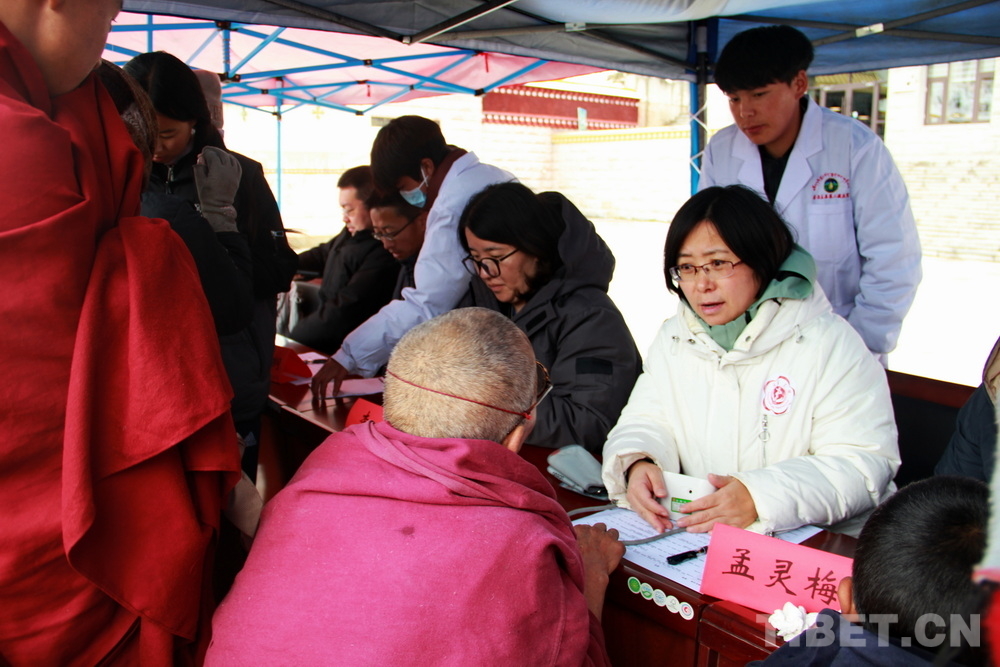 在郎木寺義診點,此前為了容納更多群眾就診,因此將義診點設在了寺院門外的小廣場。盡管大雪紛飛,但提前得知義診消息的群眾已經(jīng)陸續(xù)趕來,擔心臨時更換義診場所影響后續(xù)前來的群眾就診,醫(yī)務志愿者們毫無怨言地在臨時搭起的防雨棚下按時開始了義診。