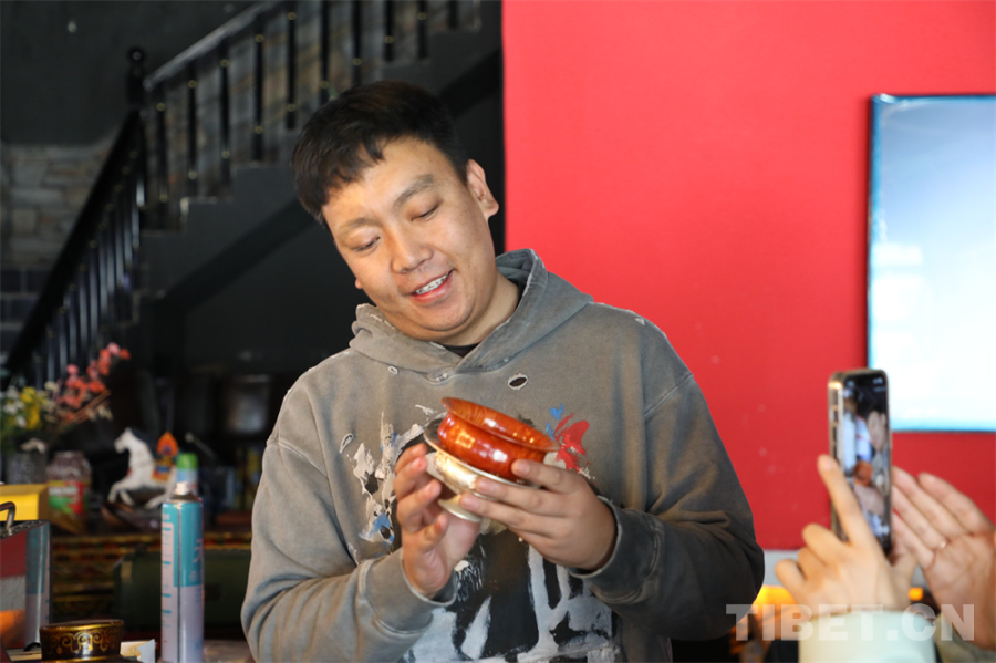 在濃郁的咖啡液里注入青稞奶,撒上當?shù)禺a(chǎn)的酸酸的奶渣和青稞粒——一碗香濃的咖啡完成了。是的,是“一碗咖啡”,索朗群培專門選用了藏族群眾喜愛的傳統(tǒng)木碗用作咖啡杯。