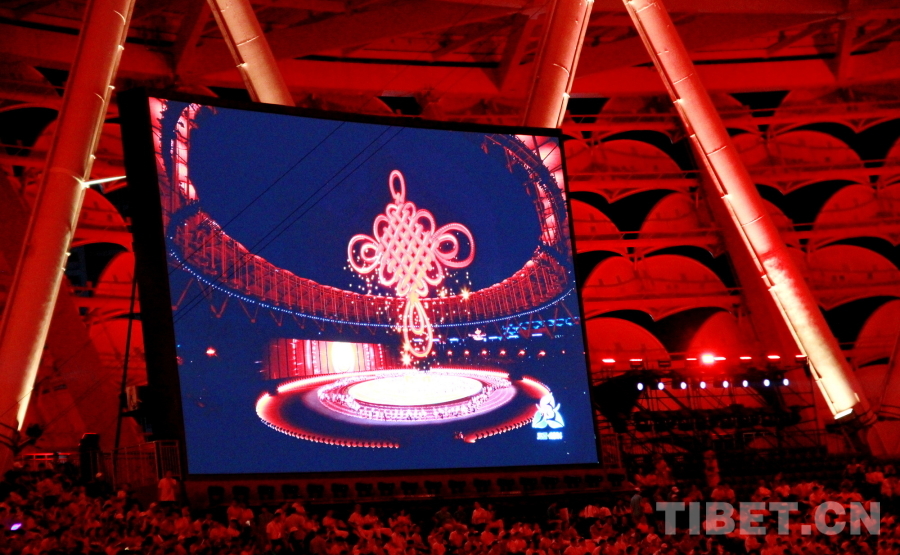 圖為第十二屆全國(guó)少數(shù)民族傳統(tǒng)體育運(yùn)動(dòng)會(huì)開(kāi)幕式上以高科技方式呈現(xiàn)的中國(guó)結(jié) 攝影:劉莉