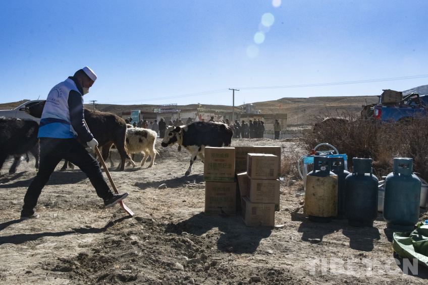 圖為在左措村地震安置點(diǎn)現(xiàn)場(chǎng),山南市乃東區(qū)甘肅青海企業(yè)家商會(huì)愛心人士正在平整土地準(zhǔn)備為受災(zāi)群眾做飯 攝影:趙振宇