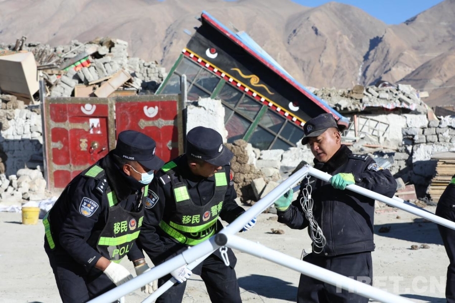 定日縣長所鄉(xiāng)雜村是此次地震受災最嚴重的區(qū)域之一,為了保證寒冷的天氣下群眾有避風休息處所,1月7日20時,參與救援的日喀則邊境管理支隊增援民警,等救災物資抵達后迅速展開帳篷搭建工作。